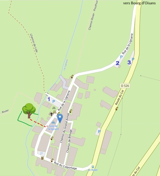 Accès au jardin : Entre les maisons vous allez trouver un petit passage (en rouge ) et traverser un petit pont au-dessus de la Lignarre